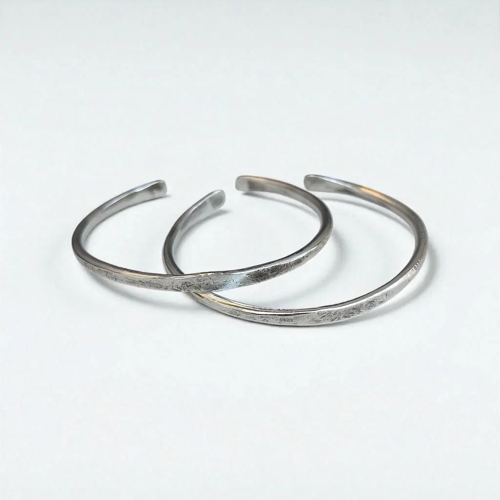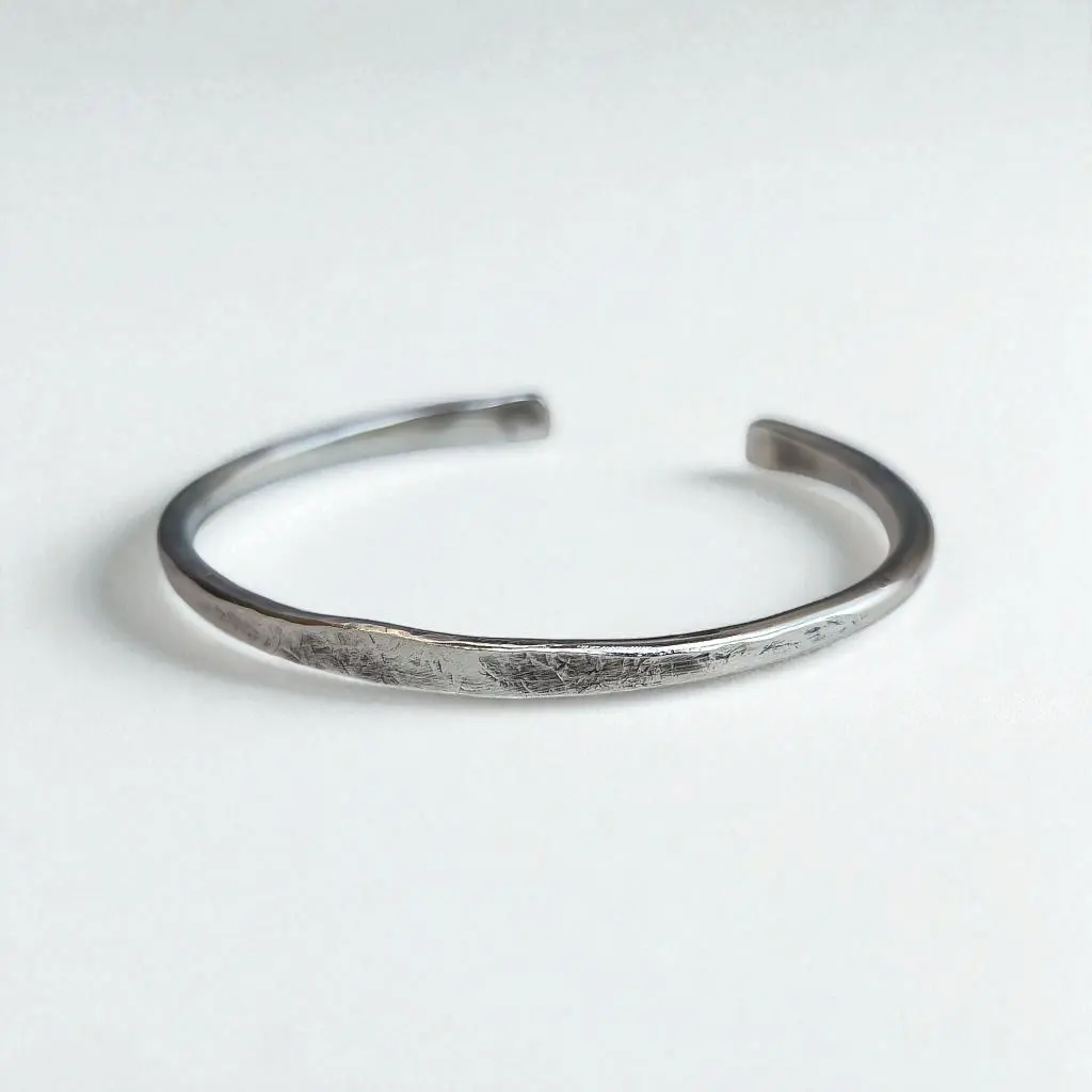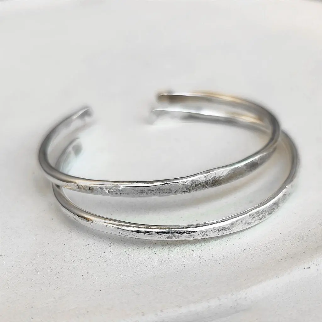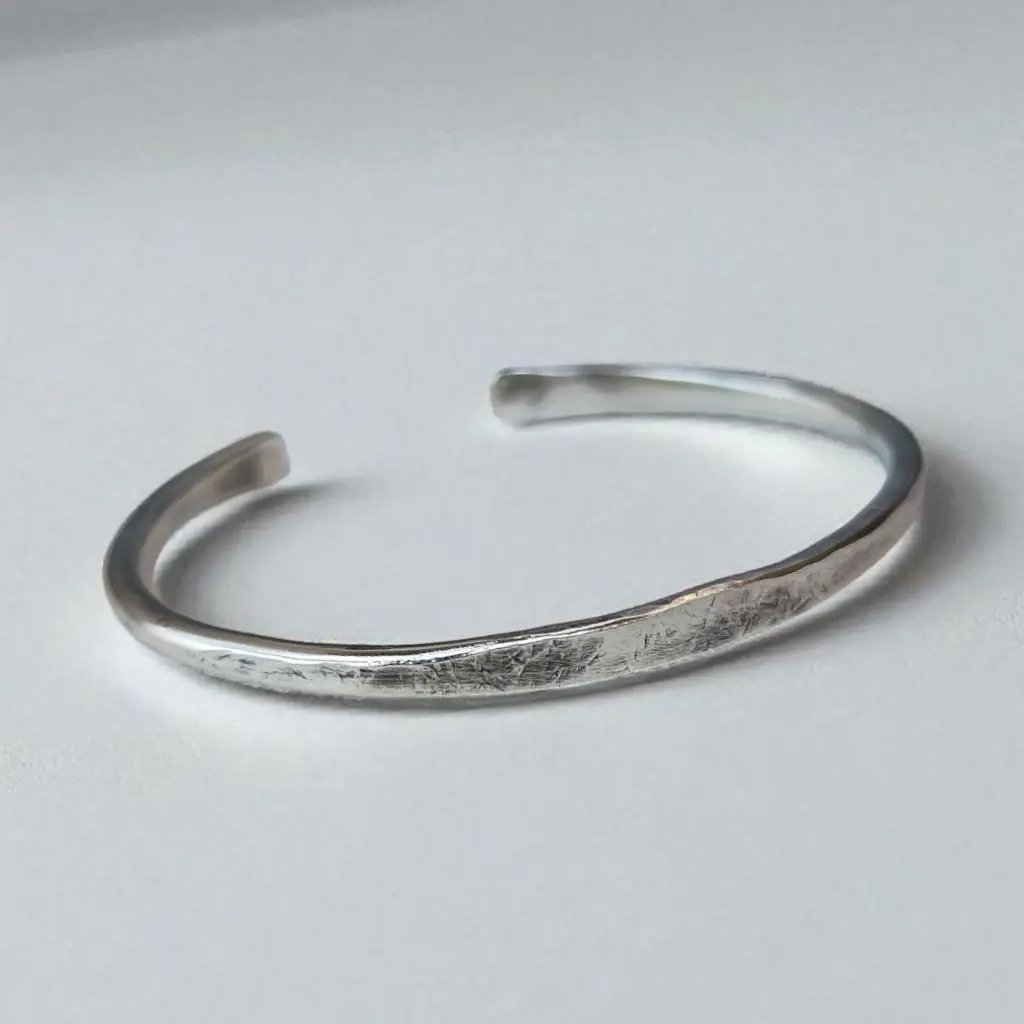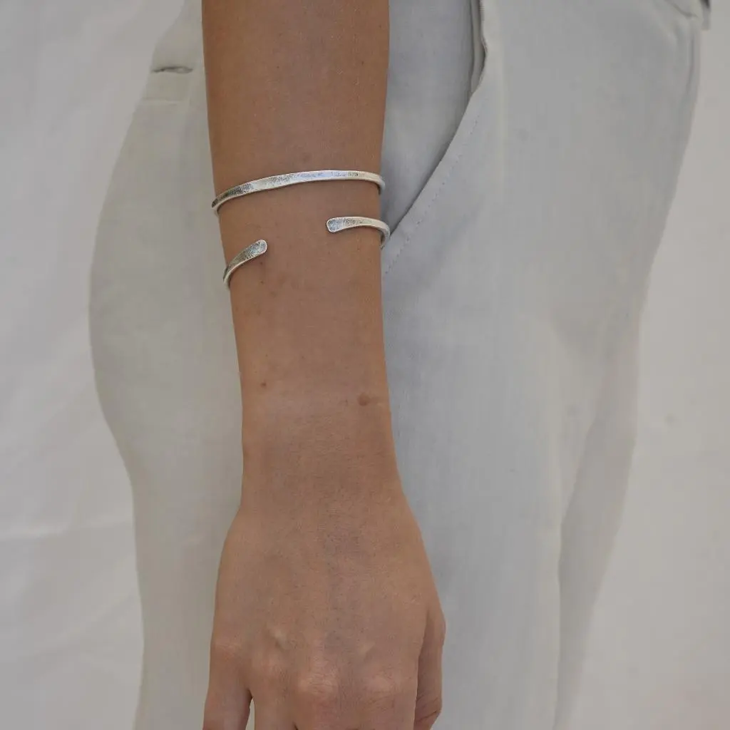 צמיד כסף פתוח לאישה בעבודת יד, עם טקסטורה טבעית שמעניקה לו מראה גולמי אך אלגנטי.